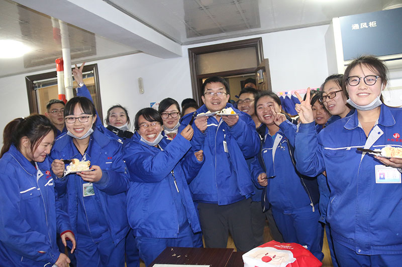 與生產(chǎn)一線職工分享廠慶蛋糕
