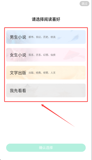 2、需先選擇個人閱讀興趣偏好,完成設(shè)置后方可進(jìn)入后續(xù)操作步驟。
