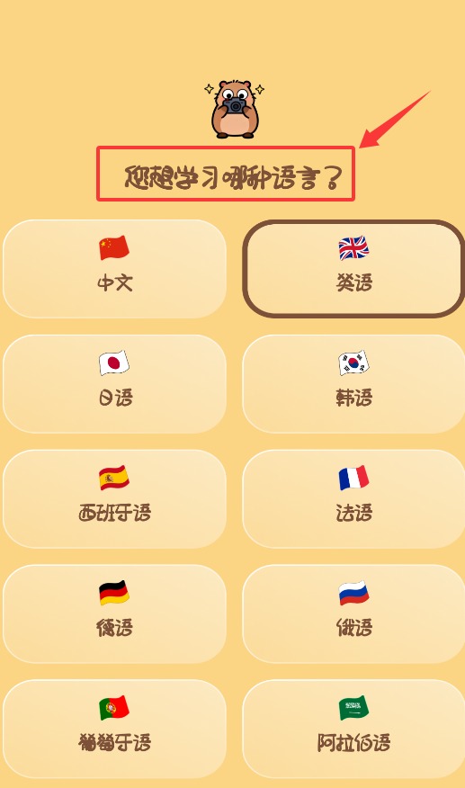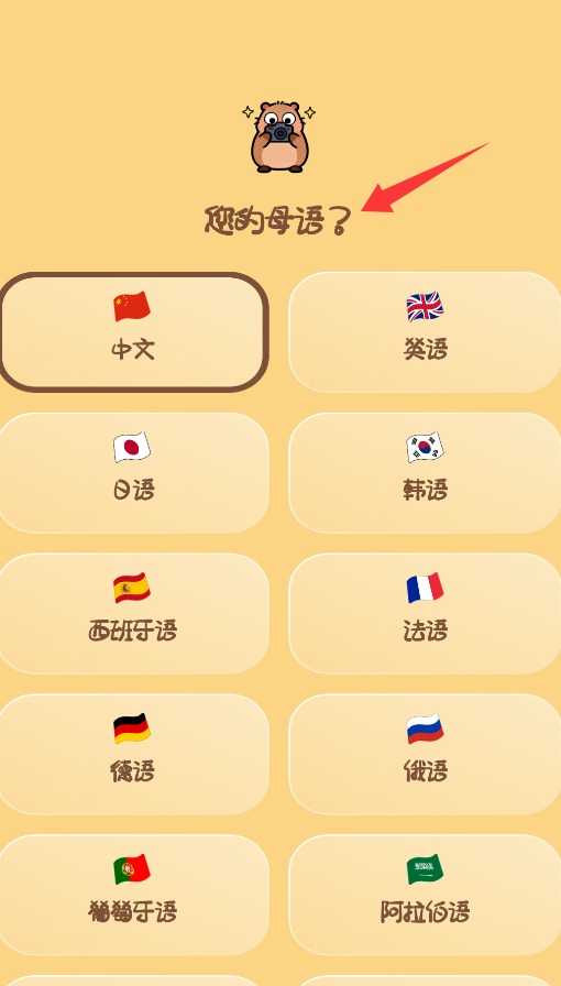 2、進入后第一步是選擇你的母語,作為后續(xù)學習的基礎設置。