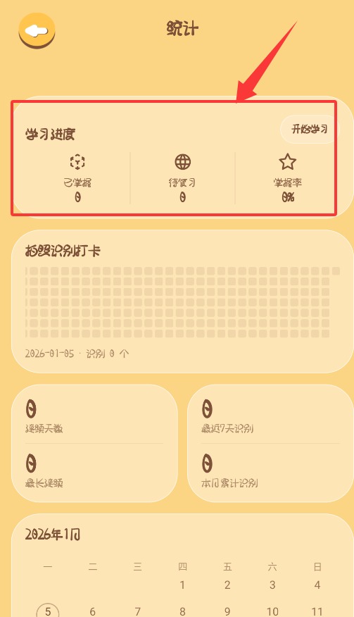 4、統(tǒng)計頁面展示學習進度、已掌握詞匯、待復習項與掌握率。
