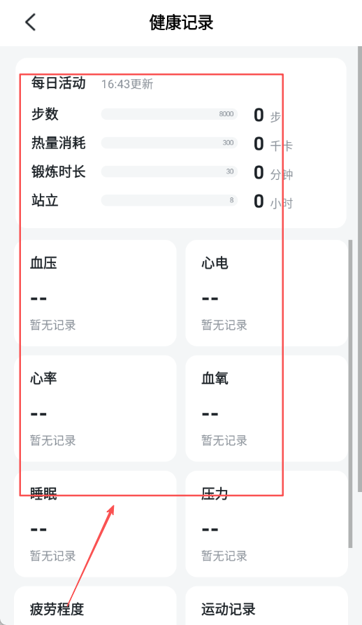 4、健康記錄模塊支持血壓、血糖等多個(gè)數(shù)據(jù)類型的錄入與統(tǒng)計(jì),用戶可以手動(dòng)添加數(shù)據(jù)并以日周月維度查看趨勢(shì)變化。