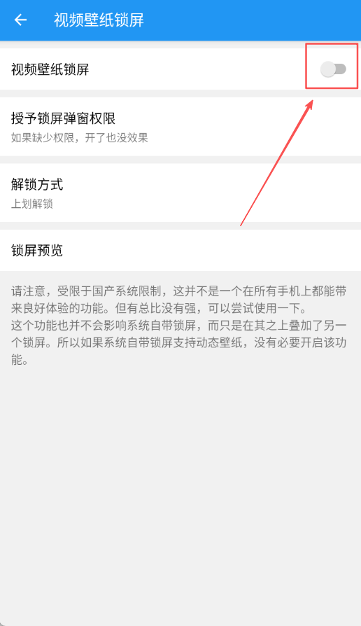 3、點(diǎn)擊開(kāi)啟視頻壁紙鎖屏開(kāi)關(guān)完成設(shè)置操作,系統(tǒng)會(huì)立即應(yīng)用設(shè)置并啟用視頻鎖屏功能。