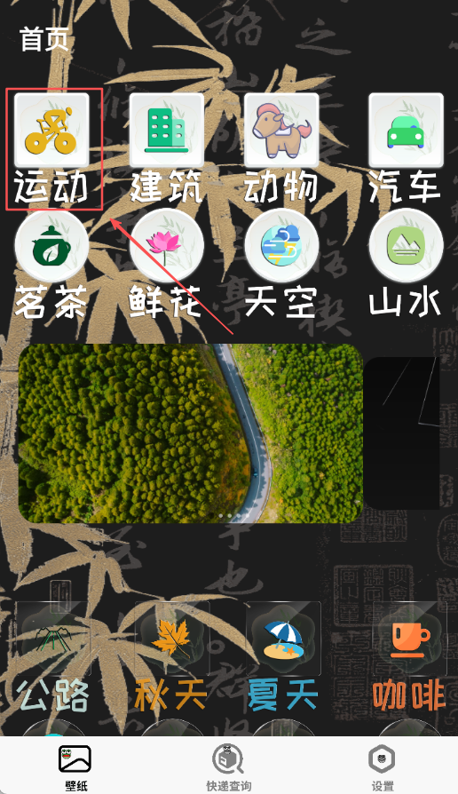 壁紙蛙通過豐富壁紙資源和直觀分類導(dǎo)航,為用戶提供高效壁紙發(fā)現(xiàn)與個性化設(shè)置體驗。軟件界面設(shè)計采用古樸典雅的中式風(fēng)格,背景融入竹葉與書法元素。清晰展示運動、建筑、動物、汽車、茗茶、鮮花等十余種分類圖標(biāo)。下方瀑布流呈現(xiàn)公路、秋天、夏天、咖啡等。