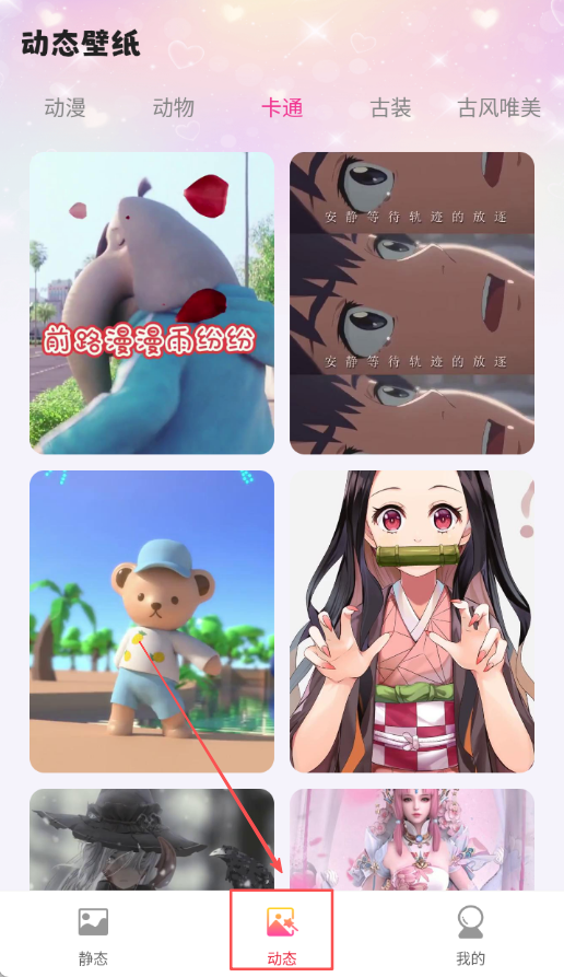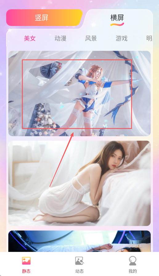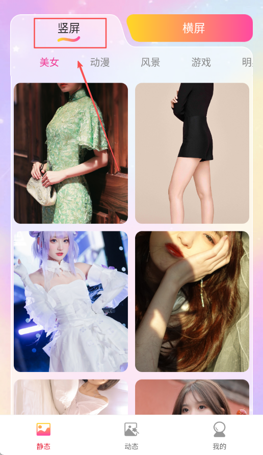 1、點(diǎn)擊靜態(tài)或動(dòng)態(tài)標(biāo)簽選擇豎屏或橫屏分類進(jìn)入頁面,進(jìn)入相應(yīng)分類頁面瀏覽壁紙資源內(nèi)容和主題展示列表。