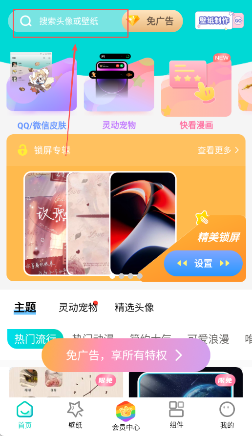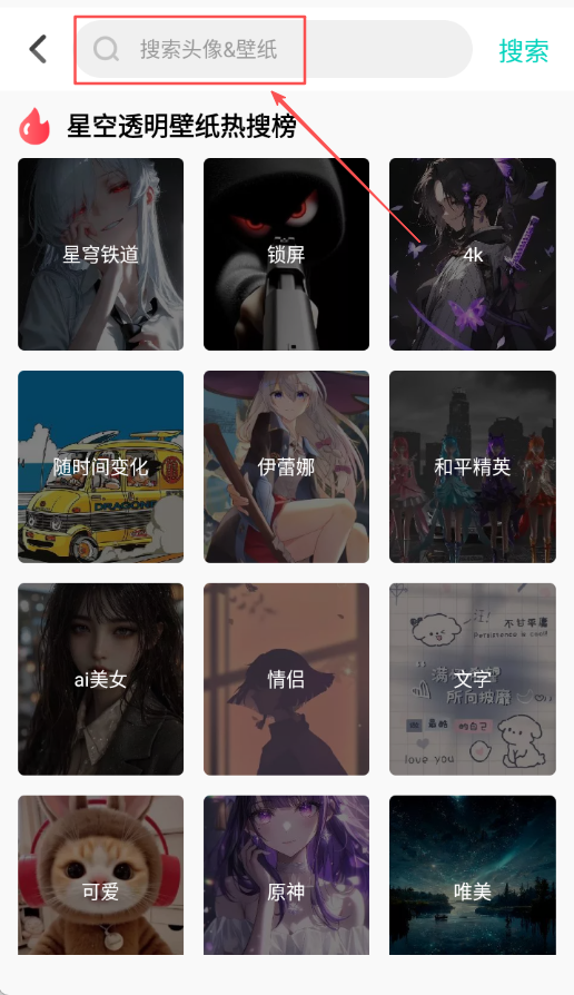 1、點(diǎn)擊頂部搜索欄進(jìn)入搜索頁面在搜索頁面輸入關(guān)鍵詞,在搜索頁面輸入關(guān)鍵詞查找壁紙資源瀏覽相關(guān)結(jié)果列表展示。